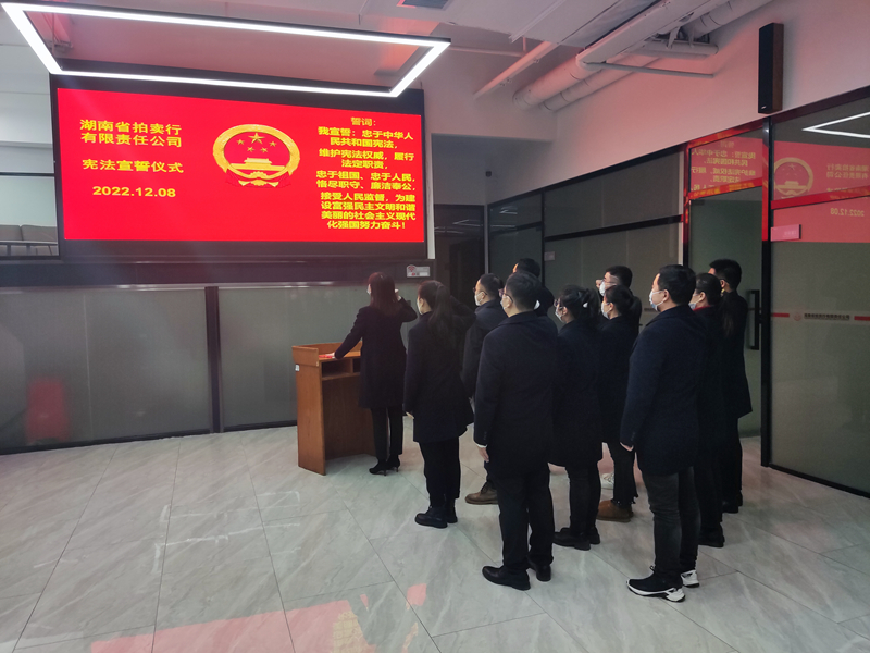 活動期間,省拍賣行組織全體員工學習習近平總書記在二十大閉幕式上的重要講話和關于憲法、法律制度的重要論述,還邀請公司法律顧問開展憲法知識宣講。完成學習后,公司黨支部書記、執行董事、總經理孫艷同志手按憲法,帶領全體員工莊嚴宣誓,用錚錚誓言表達對憲法的忠誠和敬畏。在整個宣傳周期間,省拍賣行還發動員工參加“湖南普法”公眾號的憲法知識挑戰賽,檢驗員工憲法知識掌握能力。