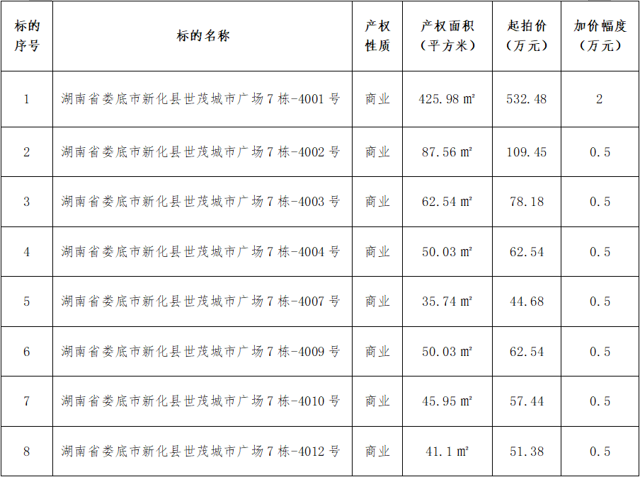 注:繳納保證金5萬元后可參拍單個競拍,請有意競買多個拍賣標的的競買人,在報名時繳納對應份數(shù)的保證金,一份保證金只能成交一個標的。標的1號至標的8號抵押在湖南新化農(nóng)村商業(yè)銀行股份有限公司,由開發(fā)商指定商場物業(yè)統(tǒng)一管理運營返租,標的1號至標的8號稅務局有查封,標的1號至標的8號婁底中院查封,已全部租賃做銀馬健身會所;均按現(xiàn)狀進行拍賣。商場統(tǒng)一管理運營,租賃期2026年8月31日到期。
