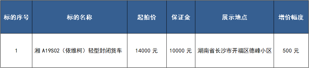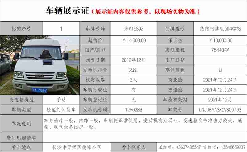意向競買人報名及保證金繳納按照湖南省聯合產權交易所(網址:www.hnaee.com)發布的《湘A19S02(依維柯)輕型封閉貨車》轉讓項目(項目編號:N0124CL210181 )相關要求辦理。具有競買資格的意向競買人應在拍賣會舉行前兩個工作日完成中拍平臺注冊認證,在拍賣會結束前辦理完成中拍平臺報名,參加競買。