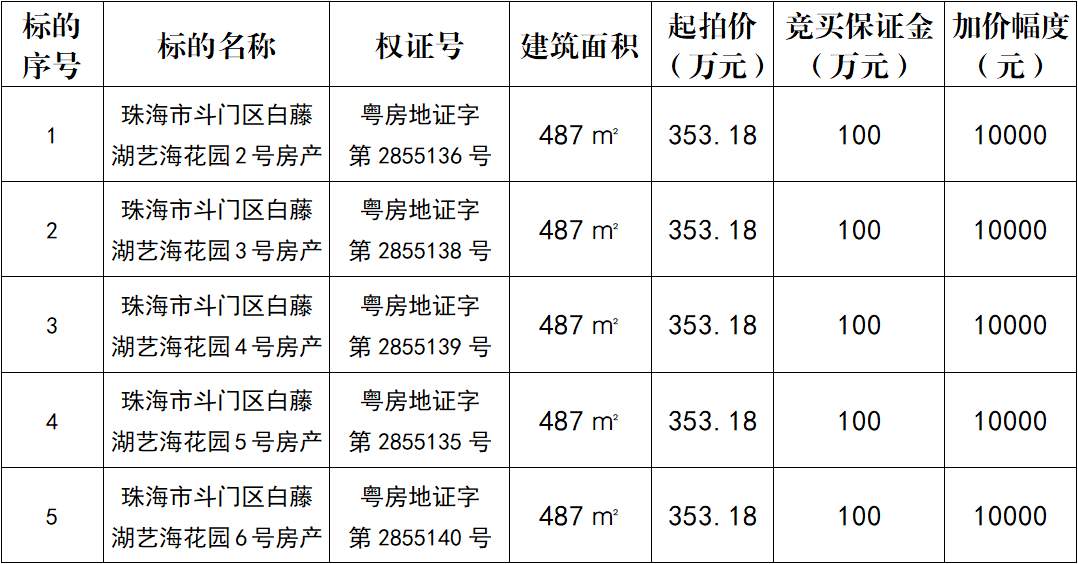 意向競買人報名及保證金繳納按照湖南省聯合產權交易所(網址:www.hnaee.com)發布的《珠海市斗門區白藤湖藝海花園2號房產》(項目編號:N0124FC220047 )、《珠海市斗門區白藤湖藝海花園3號房產》(項目編號:N0124FC220048)、《珠海市斗門區白藤湖藝海花園4號房產》(項目編號:N0124FC220049)、《珠海市斗門區白藤湖藝海花園5號房產》(項目編號:N0124FC220050)、《珠海市斗門區白藤湖藝海花園6號房產》(項目編號:N0124FC220051)相關要求辦理。具有競買資格的意向競買人應在拍賣會前兩個工作日完成中拍平臺注冊認證,在拍賣會結束前辦理完成中拍平臺報名,參加競買。