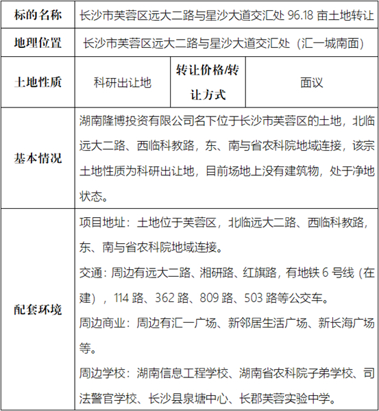 土地轉讓丨長沙市芙蓉區(qū)遠大二路與星沙大道交匯處96.18畝土地轉讓招商公告