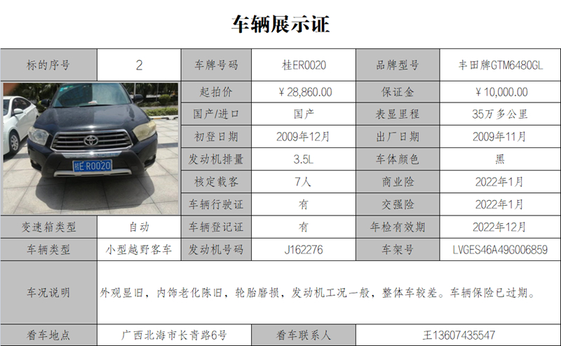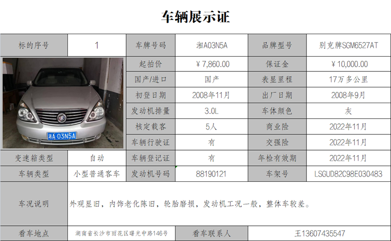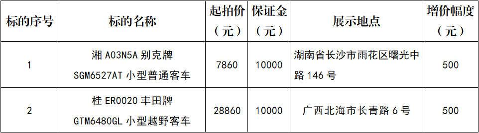 意向競買人報名及保證金繳納按照湖南省聯合產權交易所(網址:www.hnaee.com)發布的《湘A03N5A別克牌SGM6527AT小型普通客車》轉讓項目(項目編號:N0124CL220150)和《桂ER0020豐田牌GTM6480GL小型越野客車》轉讓項目(項目編號:N0124CL220149)相關要求辦理。具有競買資格的意向競買人應在拍賣會舉行前兩個工作日完成中拍平臺注冊認證,在拍賣會結束前辦理完成中拍平臺報名,參加競買。