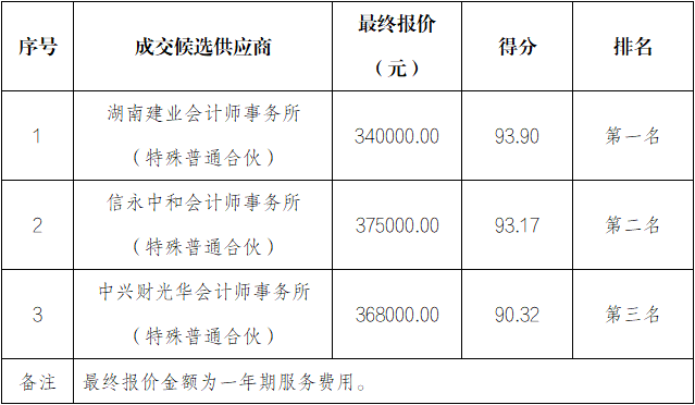 按公開選聘公告及選聘文件要求,經選聘評委會與各供應商談判,選聘人確認,成交供應商為:湖南建業會計師事務所(特殊普通合伙)。