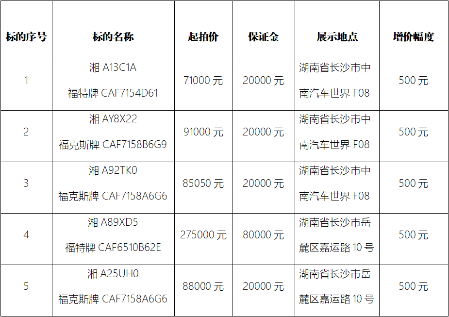意向競(jìng)買人報(bào)名及保證金繳納按照湖南省聯(lián)合產(chǎn)權(quán)交易所(網(wǎng)址:www.hnaee.com)發(fā)布的《湘A13C1A福特牌CAF7154D61小型轎車(國(guó)資監(jiān)測(cè)編號(hào)GR2022HN1001258)》(項(xiàng)目編號(hào):N0124CL220193)、《湘AY8X22福克斯牌CAF7158B6G9小型轎車(國(guó)資監(jiān)測(cè)編號(hào)GR2022HN1001257)》(項(xiàng)目編號(hào):N0124CL220194)、《湘A92TK0福克斯牌CAF7158A6G6小型轎車(國(guó)資監(jiān)測(cè)編號(hào)GR2022HN1001259)》(項(xiàng)目編號(hào):N0124CL220195)、《湘A89XD5福特牌CAF6510B62E小型轎車 (國(guó)資監(jiān)測(cè)編號(hào)GR2022HN1001260) 》(項(xiàng)目編號(hào):N0124CL220196)、湘A25UH0福克斯牌CAF7158A6G6小型轎車(國(guó)資監(jiān)測(cè)編號(hào)GR2022HN1001261)(項(xiàng)目編號(hào):N0124CL220197)轉(zhuǎn)讓項(xiàng)目相關(guān)要求辦理。具有競(jìng)買資格的意向競(jìng)買人應(yīng)在拍賣會(huì)前兩個(gè)工作日完成中拍平臺(tái)注冊(cè)認(rèn)證,在拍賣會(huì)結(jié)束前辦理完成中拍平臺(tái)報(bào)名,參加競(jìng)買。