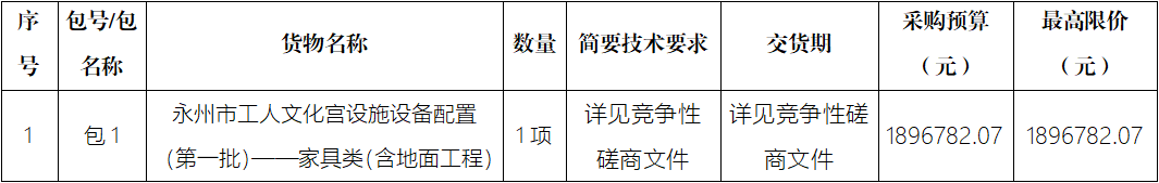 湖南省拍賣行有限責任公司受永州市總工會的委托,對永州市工人文化宮設施設備配置(第一批)——家具類(含地面工程)進行競爭性磋商采購