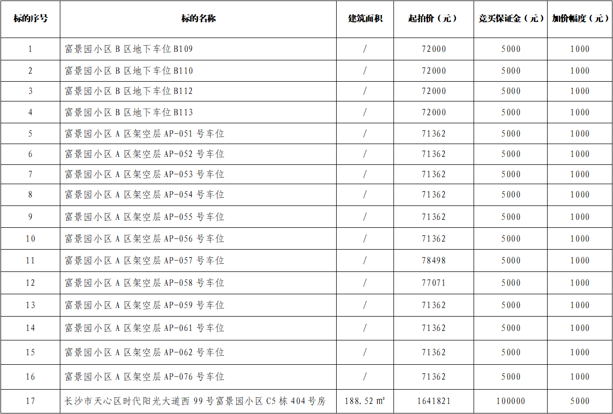 意向競(jìng)買人報(bào)名及保證金繳納按照湖南省聯(lián)合產(chǎn)權(quán)交易所(網(wǎng)址:www.hnaee.com)發(fā)布的《富景園小區(qū)B區(qū)地下車位B109》(項(xiàng)目編號(hào):N0124FC220333)、《富景園小區(qū)B區(qū)地下車位B110》(項(xiàng)目編號(hào):N0124FC220334)、《富景園小區(qū)B區(qū)地下車位B112》(項(xiàng)目編號(hào):N0124FC220335)、《富景園小區(qū)B區(qū)地下車位B113》(項(xiàng)目編號(hào):N0124FC220336)、《富景園小區(qū)A區(qū)架空層AP-051號(hào)車位》(項(xiàng)目編號(hào):N0124FC220341)、《富景園小區(qū)A區(qū)架空層AP-052號(hào)車位》(項(xiàng)目編號(hào):N0124FC220342)、《富景園小區(qū)A區(qū)架空層AP-053號(hào)車位》(項(xiàng)目編號(hào):N0124FC220343)、《富景園小區(qū)A區(qū)架空層AP-054號(hào)車位》(項(xiàng)目編號(hào):N0124FC220344)、《富景園小區(qū)A區(qū)架空層AP-055號(hào)車位》(項(xiàng)目編號(hào):N0124FC220345)、《富景園小區(qū)A區(qū)架空層AP-056號(hào)車位》(項(xiàng)目編號(hào):N0124FC220346)、《富景園小區(qū)A區(qū)架空層AP-057號(hào)車位》(項(xiàng)目編號(hào):N0124FC220347)《富景園小區(qū)A區(qū)架空層AP-058號(hào)車位》(項(xiàng)目編號(hào):N0124FC220348)、《富景園小區(qū)A區(qū)架空層AP-059號(hào)車位》(項(xiàng)目編號(hào):N0124FC220349)、《富景園小區(qū)A區(qū)架空層AP-061號(hào)車位》(項(xiàng)目編號(hào):N0124FC220350)、《富景園小區(qū)A區(qū)架空層AP-062號(hào)車位》(項(xiàng)目編號(hào):N0124FC220351)、《富景園小區(qū)A區(qū)架空層AP-076號(hào)車位》(項(xiàng)目編號(hào):N0124FC220352)、《長(zhǎng)沙市天心區(qū)時(shí)代陽(yáng)光大道西99號(hào)富景園小區(qū)C5棟404房》(項(xiàng)目編號(hào):N0124FC220332)相關(guān)要求辦理。具有競(jìng)買資格的意向競(jìng)買人應(yīng)在拍賣會(huì)前兩個(gè)工作日完成中拍平臺(tái)注冊(cè)認(rèn)證,在拍賣會(huì)結(jié)束前辦理完成中拍平臺(tái)報(bào)名,參加競(jìng)買。