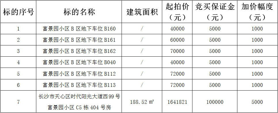 意向競買人報名及保證金繳納按照湖南省聯合產權交易所(網址:www.hnaee.com)發布的《富景園小區B區地下車位B160》(項目編號:N0124FC220337-2)、《富景園小區B區地下車位B161》(項目編號:N0124FC220339-2)、《富景園小區B區地下車位B162》(項目編號:N0124FC220338-2)、《富景園小區B區地下車位B040》(項目編號:N0124FC220340-2)、《富景園小區B區地下車位B112》(項目編號:N0124FC220335)、《富景園小區B區地下車位B113》(項目編號:N0124FC220336)、《長沙市天心區時代陽光大道西99號富景園小區C5棟404號房》(項目編號:N0124FC220332)相關要求辦理。具有競買資格的意向競買人應在拍賣會前兩個工作日完成中拍平臺注冊認證,在拍賣會結束前辦理完成中拍平臺報名,參加競買。
