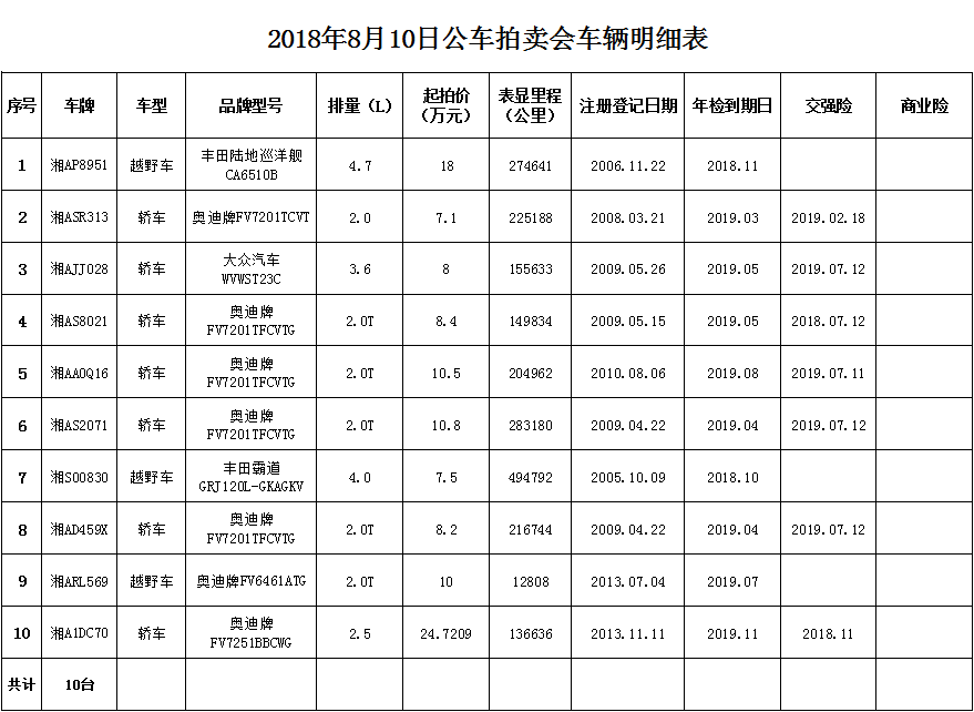 10號(hào)標(biāo)的(湘A1DC70)按委托方要求必須在拍賣成交后1個(gè)工作日內(nèi)完成尾款支付及過戶手續(xù),若因買受人原因逾期未辦理完過戶手續(xù),拍賣人將按每逾期1天收取5000元違約金,從履約保證金中直接扣除。