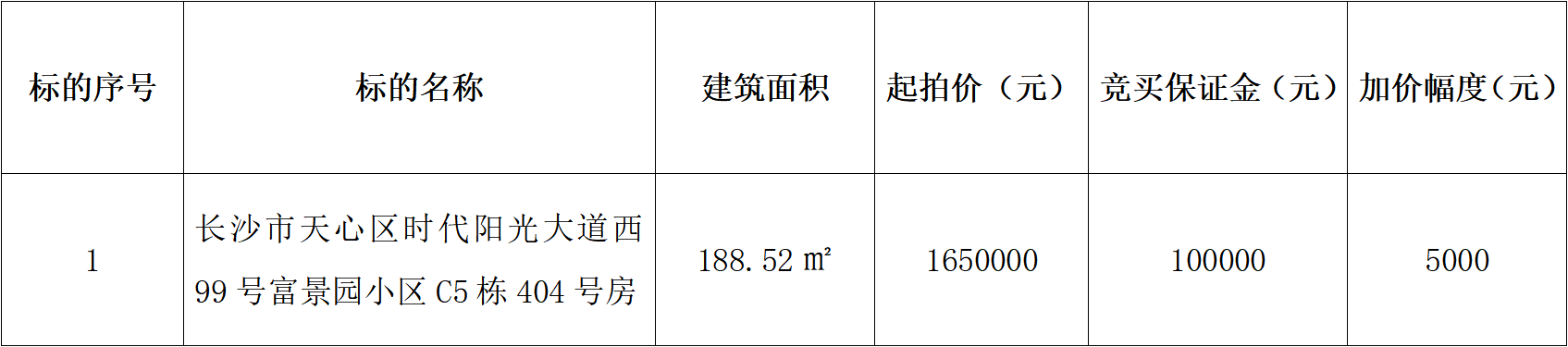 意向競買人報名及保證金繳納按照湖南省聯合產權交易所(網址:www.hnaee.com)發布的《長沙市天心區時代陽光大道西99號富景園小區C5棟404房(二次掛牌)》(項目編號:N0124FC220332-2)相關要求辦理。具有競買資格的意向競買人應在拍賣會前兩個工作日完成中拍平臺注冊認證,在拍賣會結束前辦理完成中拍平臺報名,參加競買。