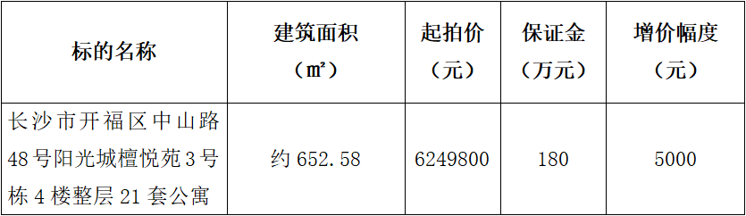 意向競買人報名及保證金繳納按照湖南省聯合產權交易所(網址:www.hnaee.com)發布的《長沙市開福區中山路陽光城檀悅苑3號棟4樓整層共21套公寓出售(二次掛牌)》項目(項目編號:N0124FC220328-2)相關要求在2023年7月28日前辦理。